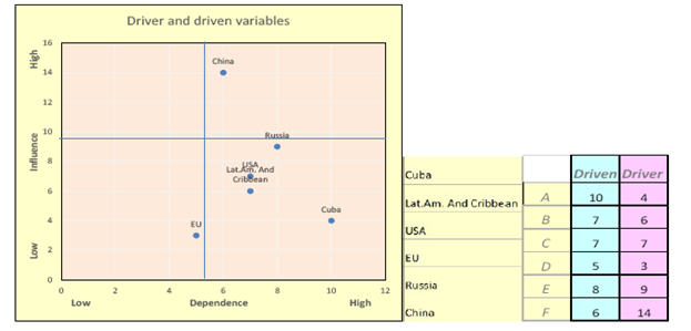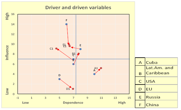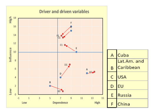 In this scenario, China and the US are two very close driver states. Russia is equally a driver and a driven state while the EU continues to obtain less influence. Latin America stays out of the conflict so its dependence and influence are not high. Cuba continues to be a driven state, even more so than in the previous scenarios. Figure 8, illustrates the direct impacts of the Cold War scenario and figure 9, the changes caused by the cross-impacts.