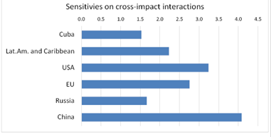 The table above illustrates the results of the Cross-Impact Analysis. We can see that China’s influence is getting smaller as a result of the cross-impacts while its dependence on other states remains largely the same. The opposite happens with Russia. Its influence does not grow by much but its dependence on other states is getting smaller. Although the change is not massive. The US gains a bit more influence and becomes less dependent on other states and the EU, in turn, loses influence while becoming even more dependent on other states. Finally, Cuba’s influence grows slightly while it becomes more dependent on other states. Figure 5, illustrates the sensitivities of the position of different countries on the cross-impacts. This shows the change of the position from the direct impacts when the cross-impacts are taken into account.