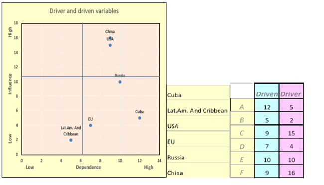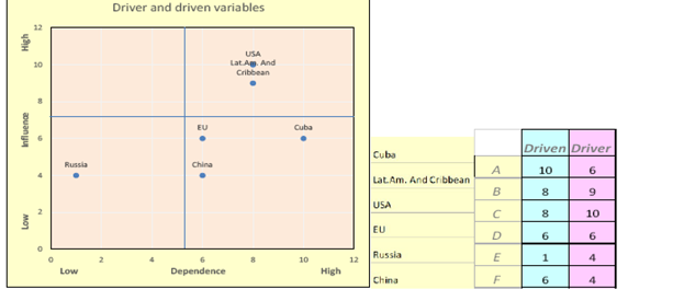 The states were selected because a) they are very influential in global power politics or b) they are expected to be affecting Cuba in some way due to their location in the world. Each impact is given a number between -4 to 4 depending on the expected state’s ability to influence the other variables. For example, if the US is given a 4, it is expected that the impact of the state will increase considerably on the other variable, for instance, Cuba. And, if the US is given a -4, it is expected that the impact of the state is going to decrease considerably on the other variable, for instance, China. All of the variables are compared against each other and based on the overall score they get they are sorted into driver states and driven states. Driver states are the states that have the largest impacts on others in each scenario. Driven states on the other hand are impacted by other states. A state can be both a driver and driven if it is impacting others but is also impacted by others.
