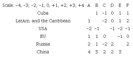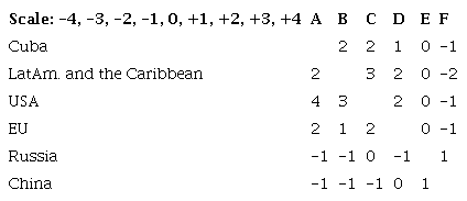 In this scenario, the US will change its foreign policy strategy and form connections to Cuba. It will also focus its efforts on the Latin American states and gain more influence in this way. Its alliance with the EU will also strengthen. In this scenario, China and Russia will take a back seat and pull their forces from Latin America. On the contrary to the previous scenario, this time the US and EU are the powerful global actors with the lead of the US. The Latin American countries and Cuba will also be able to influence the US and the EU through the alliance. China and Russia will likely continue their long-lasting relationship but on a smaller scale. Their influence on the other state is neutral or negative. See table 3.