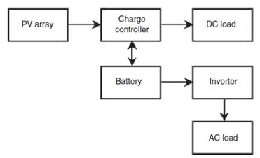 Dentro de las tecnologías desarrolladas para mitigar estos efectos se encuentra el aprovechamiento de las fuentes renovables de energía (FRE), apartir de convertidores electrónicos de potencia que permiten almacenar y distribuir la energía proveniente del sol. Dichos sistemas se pueden clasificar enautónomos, conectados a la red e híbridos, siendo estos primeros el objeto de estudio del presente trabajo. En la figura 1, se muestra la estructura en bloque de un sistema fotovoltaico autónomo, en el cual queda representados los elementos principales que lo conforman: el arreglo de paneles fotovoltaicos (PV array), el controlador de carga (chargecontroller) y el inversor (inverter); destinados al manejo y conversión de la energía proveniente de los paneles, las baterías (battery) y lascargas.