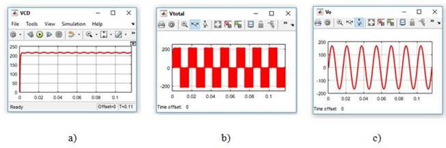 La figura 12 y figura 13, muestran el modelo de la etapa inversora y los resultados de la simulación a carga nominal, obteniéndose una tensión de salida sinusoidal de 120 V.
