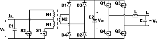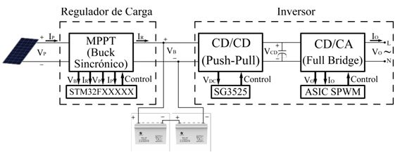 La figura 2, muestra la estructura de los sistemas fotovoltaicos y los correspondientes convertidores sutilizados. Un convertidor de Corriente Directa a Corriente Directa (CD-CD) se encarga del proceso de carga delasdos baterías de 12 V, controlado por un algoritmo de seguimiento del punto de máxima potencia (MPPTpor sus siglas en inglés) de los paneles solares. La etapa inversora está constituida por un convertidor CD-CD aislado con excitación bidireccional del núcleo Push-Pully un inversor monofásico puente completo. El convertidor Push-Pull permite, a partir del nivel de tensión proporcionado por las baterías, obtener la tensión necesaria a la entrada del inversor la cual es de magnitud similar a la de seada a la salida del sistema; a este punto se le denominó bus de CD (VCD). Es de señalar que de no detectarse baterías conectadas no segeneran señales de control y por consiguiente no se suministra energía a las cargas.