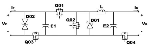 El convertidor Buck Sincrónico, cuyo esquema se muestra en la figura 3, adecua el nivel de tensión a la salida del panel fotovoltaico VP al requerido por las baterías VB,garantizando una elevada eficiencia dado por su propia estructura como por la estrategia de control MPPT utilizada. Este tipo de convertidor utiliza un MOSFET (Q02) en lugar de un diodo Schottky dado que su caída en conducción es muy pequeña e inferior a la tensión umbral típica de un diodo de potencia. Los MOSFETQ01 y Q02 trabajan de forma complementaria. No obstante ,dada la necesidad de incluir un tiempo muerto en el funcionamiento del convertidor, la corriente del inductor fluiría a través del diodo propio del MOSFETQ02 durante este tiempo, lo que afecta la eficiencia. El diodo SchottkyD01 se incorpora para minimizar las pérdidas durante el tiempo muerto, o sea, cuando ambos transistores Q01yQ02 están apagados; ya que su caída en conducción es considerablemente menor a la del diodo del MOSFET [9].