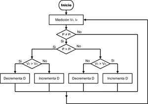 El control MPPT permite buscar el punto de máxima potencia de los paneles solares. Para realizar esta tarea en cada período de muestre o semi de la tensión y corriente del panel, calculando conestos valores la potencia que entrega. Básicamente el control se basa en la comparación de la potencia y la tensión con el valor medido en la iteración anterior respectivamente. La figura 5, muestra un diagrama en bloques del control MPPT.