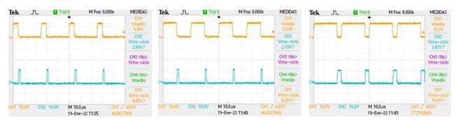 En la figura 6, se observa el proceso de búsqueda del punto de máxima potencia a partir de tres mediciones realizadas, donde se observa el incremento del ciclo útil de Q01 mientras que en el avance de este proceso se mantiene constante el ciclo útil de Q02. La última imagen de la secuencia muestra las señales de control de ambos transistores, una vez establecido el punto de máxima potencia.