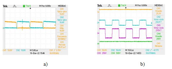 En la figura7a, se muestran las señales entre ¨gate-source¨ aplicadas a los transistores S1 y S2 del convertidor Push-Pull. Como se observa trabajan en contrafase, con un ciclo útil similar al calculado y frecuencia de conmutación alrededor de 40 kHz. Se puede apreciar el tiempo muerto entre las señales que impide que ambos semiconductores entrenen conducción a la misma vez. En la figura7b, se observa el comportamiento bidireccional de este convertidor.