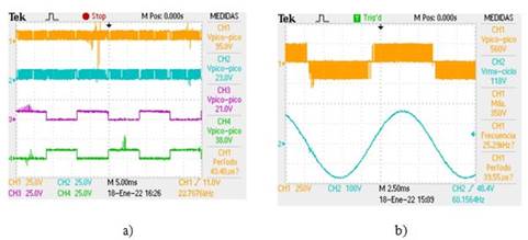 Las características de la modulación PWM sinusoidal implementada se observan en la figura 8. En cada diagonal un transistor trabaja a la frecuencia de salida deseada de 60Hz mientras el otro conmuta a una frecuencia de 23kHz aproximadamente (figura8a). Este tipo de estrategia se conoce como modulación PWM híbrida [10]. Las señales mostradas en la figura8b, se corresponden a la tensión de salida antes y después del filtro LC. Como resultado se obtiene una señal de alterna cuyo valor efectivo es 118 V a una frecuencia de 60Hz.