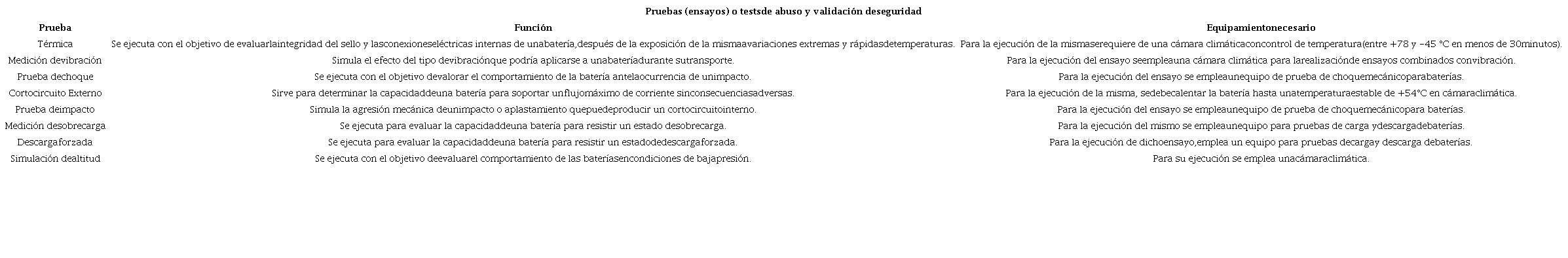 En función de comprobar el cumplimiento de los parámetros de operación y seguridad a cumplir por las baterías a emplear en los vehículos eléctricos, se reportan un grupo de pruebas (ensayos) a ejecutar y el equipamiento requerido para su realización, todo lo cual se expone en las tabla 1 y tabla 2.