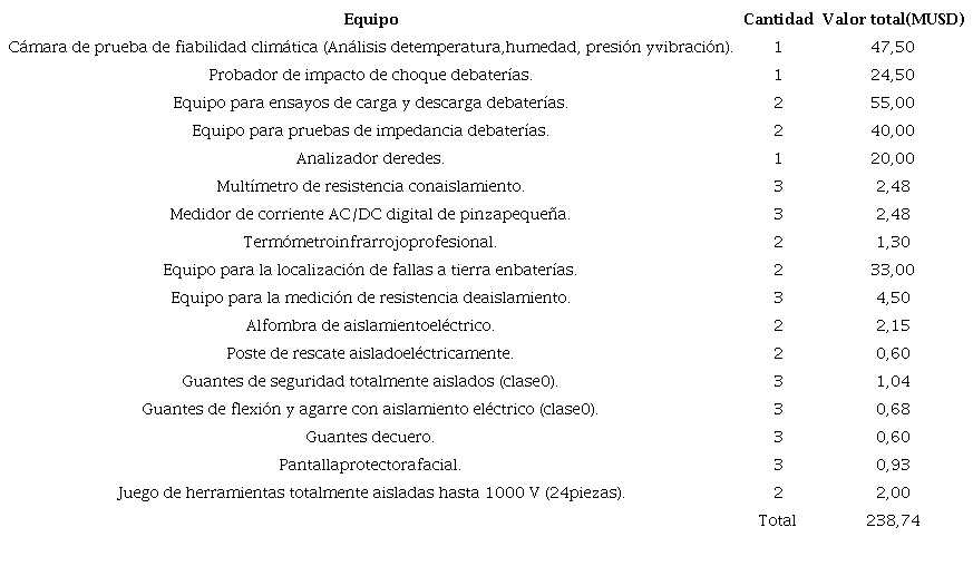 A partir de los requisitos técnicos a cumplir por el equipamiento necesario para la ejecución de los ensayos, en la tabla 4, se muestra el costo aproximado de cada equipo y/o elemento necesario para trabajar en un laboratorio de ensayos y homologación de baterías, basado en los costos promedios obtenidos en Internet de los mismos.
