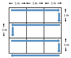 Paso 2: Se dividió el ambiente en una malla imaginaria con puntos de intersección a un metro de distancia uno del otro. Las mediciones se hicieron en dichos puntos a una altura de un metro sobre el nivel del suelo, comenzando por la parte más alejada de la puerta, como se muestra en la figura 3.