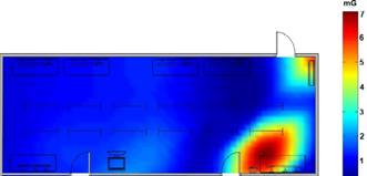 Paso 3: Se representaron mediante el mapeo de colores, los ambientes electromagnéticos de cada área, identificando a través de la escala en miligauss (mG), que por defecto posee el equipo de medición [6], los valores promedios de inducción magnética resultante en cada uno de los puntos para cada condición de medición. Correspondiéndose el color rojo al mayor valor promedio obtenido de medición.