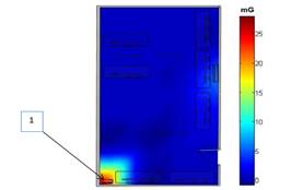 En el Dpto. de Soporte de Vida (Local 1), mostrado en la figura 4, se evidenciaron la presencia de fuentes generadoras de campo magnético enumeradas como 1 y 2 enmarcadas en un cuadro. Una de ellas perteneciente a una fuente de alimentación (1), y el (2) a un aire acondicionado. Para los cinco días de medición, aunque ambos puntos arrojaron valores entre 1,05 µTy 1,14µT, el ambiente electromagnético promedio de todo el local fue de 0,239 µT. En el Dpto. de Soporte de Vida (Local 2) representado en la figura 5, a pesar que el valor señalado como punto 1 equivale a 2,79 µT, el promedio de inducciónmagnética del área equivale a 0,118 µT. Este valor se debe a que el resto de los promedios puntuales obtenidos en las mediciones, no sobrepasan los 0,5 µT y hace que se compensen las radiaciones ambientales por todo el local.