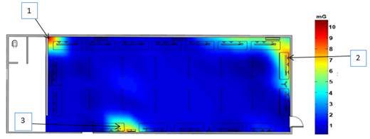 En el Dpto. de Electro-óptica el promedio obtenido fue de 0,158 µT, los mayores valores se obtuvieron en tres puntos de interés. En la señalización 1, de la figura 6, el valor obtenido en la medición tiene justificación visible en el mapa de colores. Este punto resalta en color rojo debido a la colindancia del mismo con el local en el que se someten equipos electromédicos a un proceso de desinfección por luz infrarroja. La radiación infrarroja es un tipo de CEM y como este atraviesa cualquier medio, no es raro que se encontraran valores alrededor de 0,87 µT en este punto específico. En este mismo local, la señalización 2 representa una coloración extendida debido a la presencia de una red de cableado coincidente con los puntos de medición en esa zona, lo preocupante de esto es que se encuentran al nivel de la cabeza y cuello del trabajador mientras está sentado en su puesto de trabajo y la radiación que emana es constante, los niveles de campo hallados en esos puntos están comprendidos entre 0,5 µTy 0,8 µT. La señalización 3, representa una cabina de seguridad eléctrica, el valor máximo fue de 6,8 mG aproximadamente. En el resto del área los valores se encontraban por debajo de 0,15 µT lo que evita que el promedio del área sea alto, con un valor de 0,158µT.