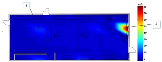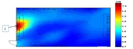 En el Dpto. de electromecánica el promedio que se obtuvo fue de 0,318 µT a pesar de los puntos marcados como mayores valores en la figura 7. En esta área el mapa de colores, aunque se encuentra en color azul representativo de valores bajos, los mismos se localizan sobre los 0,5 µT. La señalización 1 reveló un valor promedio de 0,80µT, perteneciente a un flujo laminar que actualmente hace la función de ventilador. La señalización 2 corresponde a uno de los aires acondicionados, que mientras estaba en funcionamiento marcaba valores de medición de entre 0,75µT y 0,102 µT; en este punto también hay influencia, aunque no tan cercana, del sistema de elevadores y puede ser un aporte poco significativo pero evidente, en los momentos de la medición del área, como resultado de una interferencia entre los campos emanados por ambos. No obstante, debido a que es el área de mayores dimensiones y menor concentración de puestos de trabajo, puede que su campo magnético ambiental tenga mayor capacidad de dispersión y por ende el valor de inducción del área se haga menos notable.