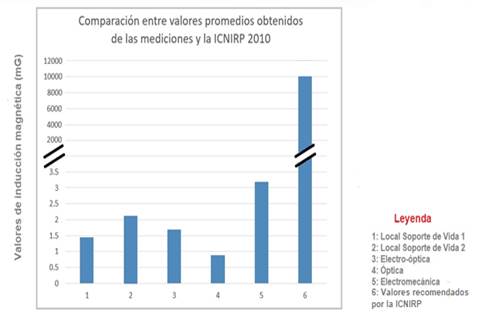 Se logró realizar la medición de campo magnético en los cinco locales propuestos en esta investigación y con ella su caracterización. La comparación y análisis de los resultados obtenidos, con las recomendaciones de la ICNIRP demuestra que los valores a los que están sometidos los trabajadores se encuentran por debajo de las recomendaciones, aunque deben vigilarse casos puntuales dentro de los locales, donde estos valores se encuentran excedidos para la ubicación de los puestos de trabajo.