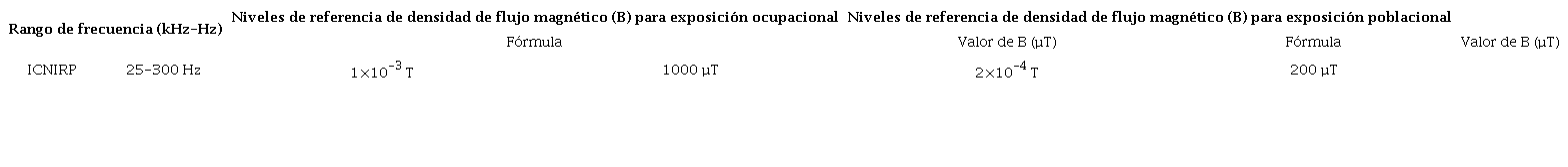 Las recomendaciones escogidas para comparar los valores obtenidos son las de la ICNIRP en 2010, [3] como se muestra en la tabla 1, se utilizó el valor para límite ocupacional enmarcado en rojo.