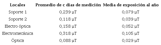 Haciendo uso de la ecuación (1) se obtuvieron valores estimados de inducción electromagnética en un año para cada local, los que se muestran en la tabla 3. Se utilizaron como valores para sustitución de parámetros los siguientes: