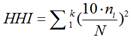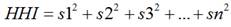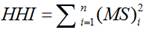 Being a commonly accepted measurement of market concentration, the HHI measures the ratio of firm size to the industry size as a proxy for the degree of competition among them (Herfindahl 1950, Hirschman 1964, Adams 2017). As noted above, the HHI index is defined as the total squared market shares of all firms within the industries at stake. The result of this exercise may range from 0.0 to 1.0, thus spanning a continuum ranging from the prevalence of a considerable number of tiny firms to a situation defined by only a monopolistic firm. HHI increases are typically understood as indicators of decreases in competition and increases in market power [14, 15, 16, 17]. One key advantage of the HHI vis-à-vis the C.R is that the former gives more weight to larger firms as it accounts for relative firm size distributions in each market. In fact, the former’s calculation differs from the latter’s insofar as an equation (1), for determining the HHI is as follows [18]: