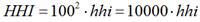 Yet, there is a way to remove the “1002”-part of the equation, as we can replace percentages with the decimals of 0.01-0.99, corresponding to 1-99%. Thus, we also avoid calculational problems related to values 0-10000, which are less intuitive than percentage values. Thus, we may create the index hhi, which means the HHI index (see equation (4)), without 1002.