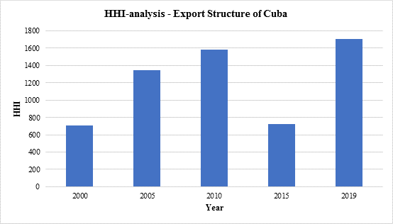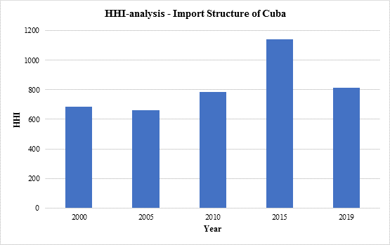 We can observe that after 2005 concentration trend of Cuban import activities continued till 2015, but 2019 slightly became more diversified in 2019. Further more, we can note that based on HHI analyses, the export portfolio of the Cuban economy is more concentrated than the import portfolio of the Cuban economy.