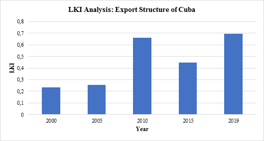 In figure 3, we report the results of the LKI analysis of the Cuban economy. This index-based analys is reveals that after 2005, the concentration of export structures increased considerably in the Cuban trade. However, in 2019, the concentration trend decreased slightly, almost at the same level as in 2010.