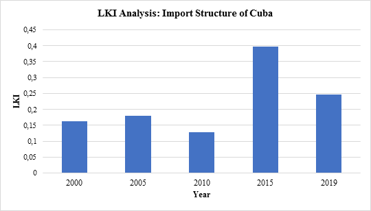 We can note thatbased on LKI analyses, the export portfolio of the Cuban economy is more concentrated than the import portfolio of the Cuban economy. The results are similar to HHI analyses.