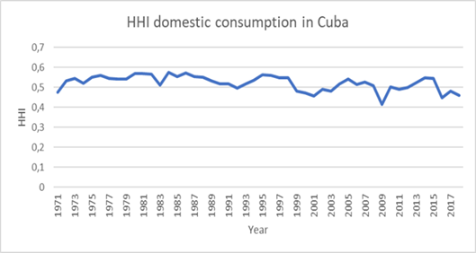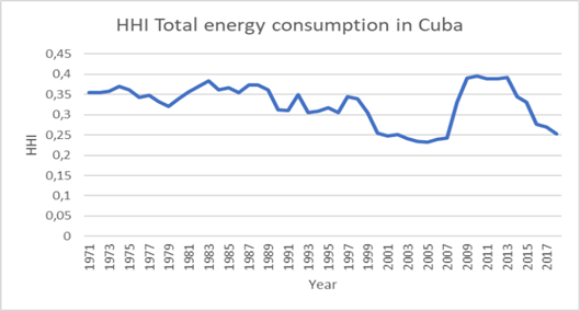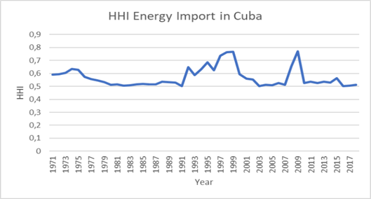 In figure 5, we report the results of the HHI analysis of import energy consumption in the Cuban economy. In this figure, we can easily observe the peak moments of import energy resilience problems in the Cuban economy. The Soviet Union´s socioeconomic collapse and,later, the global financial crisis created two destructive historical resilience crises in the Cuban economy. However, we can also note that resilience has been relatively stable in the long run, being about on HHI 0,6 level.