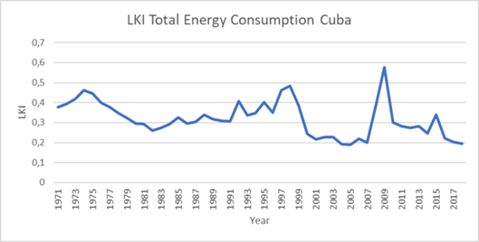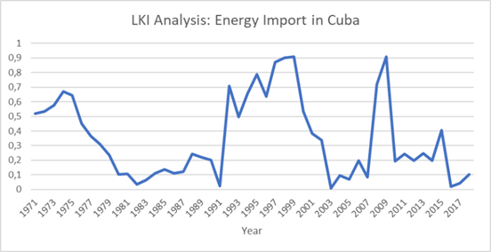 A novel LKI analysis reveals new information regarding Cuba's energy import resilience challenges. The analysis results suggest that there would have been more significant fluctuations in the resilience levels compared to what the HHI analysis told us in figure 5. This new scientific result and findings hould certainly be investigated further. There can also bestatistical and measure men terrors, which may explain these strong fluctuations. However, we can observe dramatic changes after the Soviet Union´s collapse and during the global financial crisis in Cuba.