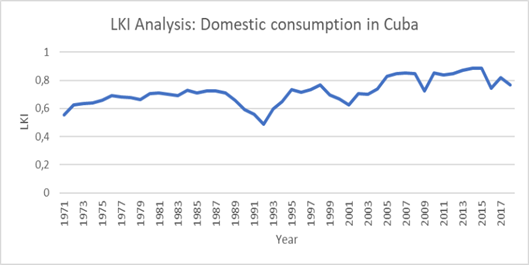 Figure 2, shows that resilience, measured by the LKI trend, wasquite favorable in Cuba from 1971-2007; after 2007,the situation became less resilient when LKI jumped almost to the 0,6 level. Again, after the 2007-2008 alarming resilience problems, diversification of energy sources increased, probably because of the high pricelevel of oil and other fossil fuels. The LKI analysis provides more sensitive results than the previous HHI analysis (figure 1). Again, an informed guess is that all these changes in the LKI resilience level are linked to the Cuban economy's external shocks faced in history. In figure 3, we report the results of the HHI analysis of domestic energy consumption in the Cuban economy.
