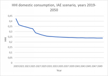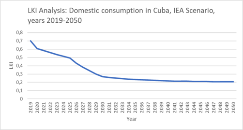 When we observe figure 8., we can seethat the general expectation isthat Cuba will improve its energy resilience from HHI 0,7 (2019) to HHI 0,2 (2050). This findingis, of course, a very positive expectation of energy resilience.