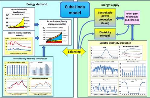 The CubaLinda model constructs scenarios for different sectors of the economy and calculates the fuel used in different sectors, related CO2 emissions, and electricity production costs (Levelized Cost of Electricity, LCOE) based on user-given information of future investment costs, operation and maintenance costs, and fuel cost for different power plant types and fuels. The model also calculates the required ramping rates (need for maximum change in power production per hour) and load duration curves to assess types of power plant capacity investments.