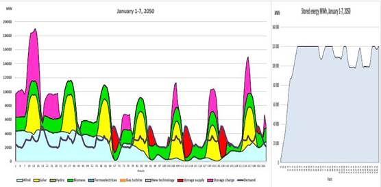 When we look at the electricity production and demand in the first week of January 2050, in this scenario, we can find out that the renewable energy capacity, together with the increased storage capacity, is sufficient to produce all the needed electricity, as can be seen in figure 10. However, there is considerable overproduction of electricity in this scenario on some days. The storage capacity is not large enough to store all the excess energy, and the storage capacity reaches its maximum limit on the second day of the operation.