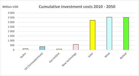 An approximation of cumulative investment costs for Scenario 2 during 2010-2050 is given in figure 12. The cumulative investment costs are calculated based on assumptions of sharply reducing costs of solar PV and wind power investments. Solar PV investment costs are assumed to reduce from 1500 USD/kW in 2010 to 400 USD/kW in 2050, and the wind power investment costs from 1500 USD/kW in 2010 to 600 USD/kW in 2050. In addition, the capacity factor of wind power production is assumed to increase due to the new types of wind power plants with considerably higher hub heights. The investment costs of fossil and biofuel power plants are assumed to remain constant.