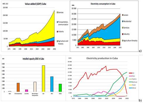 The CubaLinda model has been used to construct different future scenarios to analyze the changes in electricity consumption and production when lots of new solar PV and wind power capacities are installed. First, we have constructed a base scenario until 2050 concerning economic development and electricity demand. Then, based on it, we have used the backcasting scenario method [4], to analyze the possibilities of reaching the 100 % renewable scenario. In the backcasting scenario construction, the target for the end-year situation is the starting point. Then, the model input data is modified to see the possibilities for reaching the target.