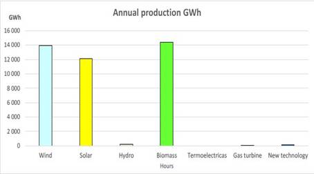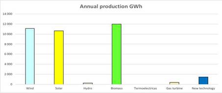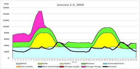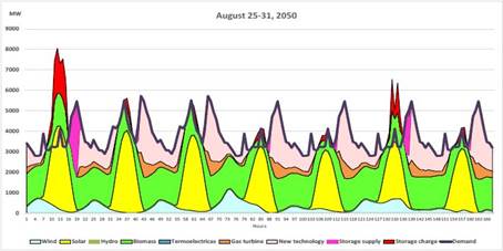 Biofuel, wind, and solar productions are increasing considerably, while oil-based production decreases fast due to investments in renewable capacity. It is assumed that termoeléctricas do not generate in this scenario in 2050 because of the fast response needed for the residual production and the form of the residual load duration curve, which implies that there is no room for baseload production. In this scenario, wind and solar capacity growth after 2024 is assumed to be 10 percent annually until 2050.
