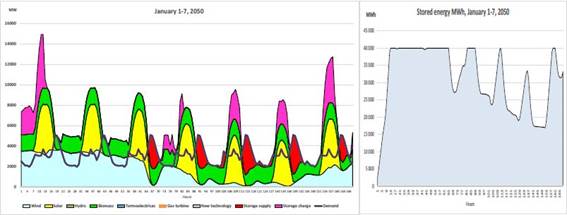 Looking at the first week of January (see figure 4), we notice that renewable sources cannot cover all the demand on January 5th, 6th, and 7th. During these days, the wind speed decreases (in the reference year), and renewable production is too low to cover the demand even though biomass production uses the total available capacity. As a result, the storage capacity needs to be used to balance production and consumption, as shown in figure 4.