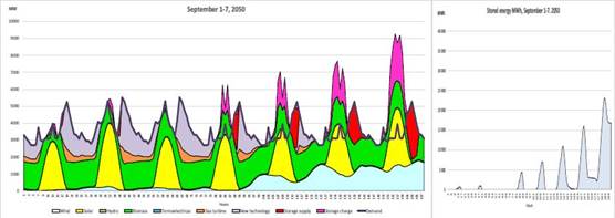 When the wind speed reduces during August-October, the renewable capacity is insufficient to produce all the required electricity, as shown in figure 11 a), for the last week of August 2050. During this period, the stored energy capacity partly increases during the daytime when solar production increases. However, the low wind speed and the resulting low production of wind power cannot produce enough to cover the demand, and fossil production is required.In early September, the wind speed is still meager (in the reference year data), and fossil energy is needed to cover the demand, see figure 11 b).