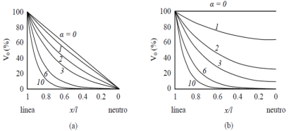 Esta distribución oscilatoria se produce durante la transición entre la distribución inicial y final de la tensión, donde la tensión en cualquier punto del devanado oscila de forma amortiguada en torno a su valor final hasta alcanzar la distribución final de la tensión. Al final del fenómeno transitorio, los elementos resistivos gobiernan la respuesta del devanado y se establece una distribución final de la tensión que es generalmente uniforme, la cual corresponde a la distribución de la tensión en estado estacionario. La distribución inicial está determinada por el valor del parámetro 𝛼 llamado constante de distribución como se muestra en la figura 3. Para 𝛼 = 0, la distribución inicial de la tensión es lineal y coincide con la distribución final de la tensión. Para otros valores de α, la distribución inicial de la tensión no es lineal y aparecerán oscilaciones transitorias que oscilaran en torno a la distribución final.