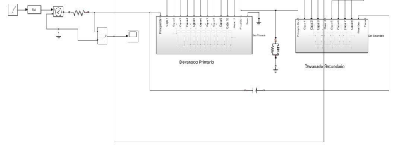 En este trabajo, se utiliza el modelo del transformador para alta frecuencia como el mostrado en la figura 1. De igual manera, en la figura 4, se muestra dicho modelo desarrollado. El circuito de impulso que se utiliza, se muestra en la figura 5. Este circuito genera un impulso tipo rayo, que tiene una forma de onda 1,2/50𝜇𝑠.
