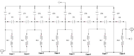 En la figura 6, se muestra detalladamente, la distribución interna de las espiras del devanado, agrupadas en capas formadas por resistencias, inductancias y capacitancias longitudinales (CL) y transversales (CT).