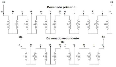 (3)Para medir la diferencia de potencial que va a soportar el aislamiento entre cada capa de los devanados y entre los terminales y tierra, se establecieron los puntos de medición que se muestran en la figura 7.