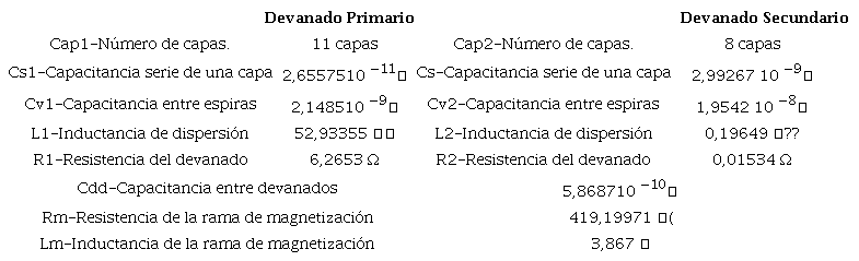 Para obtener el valor de la resistencia por cada capa se necesita conocer el valor de la resistencia total del devanado y dividirla entre la cantidad de capas, de forma similar se procede con los valores de la inductancia. En el caso de los valores de las capacitancias longitudinales y transversales se procede de forma diferente. Para obtener los valores de la capacitancia serie por capa del devanado (CL), es necesario utilizar el valor de la capacitancia entre espiras (Cv) y dividirlo entre el número de vueltas que tiene cada capa. Vea ecuacion (2):
