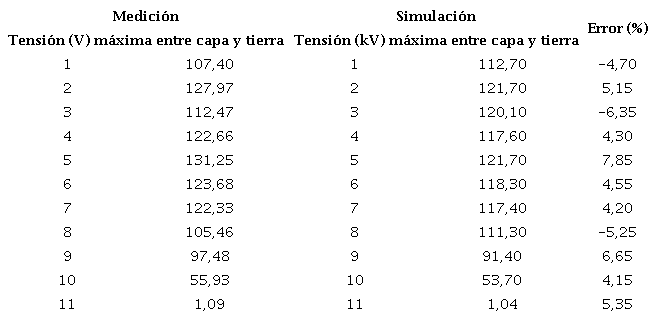 Para la validación del proyecto se utilizó el mismo prototipo de transformador de distribución utilizado en la simulación, aprovechando que tiene las mismas derivaciones que se muestran en la figura 7. A ese prototipo se le aplicó una tensión de impulso de 100 V a partir del generador de impulsos repetitivos de baja tensión con que se cuenta en el Laboratorio de Alta Tensión. La medición se efectuó entre cada derivación del transformador y tierra, utilizando un osciloscopio digital Rigol. La comparación de los resultados de la medición y la simulación se muestran en la tabla 2.
