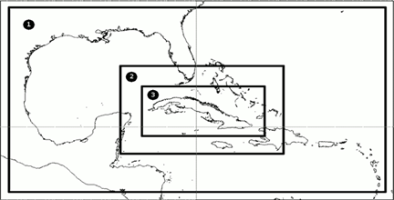 The forecast system is based on the WRF numerical model (Weather Research and Forecasting) [1], which has been installed and configured according to regional conditions and is the core of the SisPI forecast system developed at the CFA [2, 3], which provides operational meteorological numerical forecasts that contribute to the general forecast service of the INSMET. In this way, the power generation forecasts are implemented as additional services of the SisPI system. The WRF model within SisPI is configured as an arrangement of 3 domains of integration. The outer domain (domain 1) has a distance between nodes of 27 km, with the center at 22.3 degrees’ north latitude and 79.1 degrees’ west longitude; it has 145 points in the east-west direction and 84 points in the north-south direction. The intermediate domain (2) has a distance between points of 9 km, 262 points in the east-west direction and 130 in the north-south direction and the third domain, which is the one from which the generation forecasts are made, has a distance of 3 km and dimensions of 469 points in the east-west direction and 184 in the north-south direction. Figure 1, shows the described domain configuration.