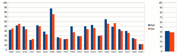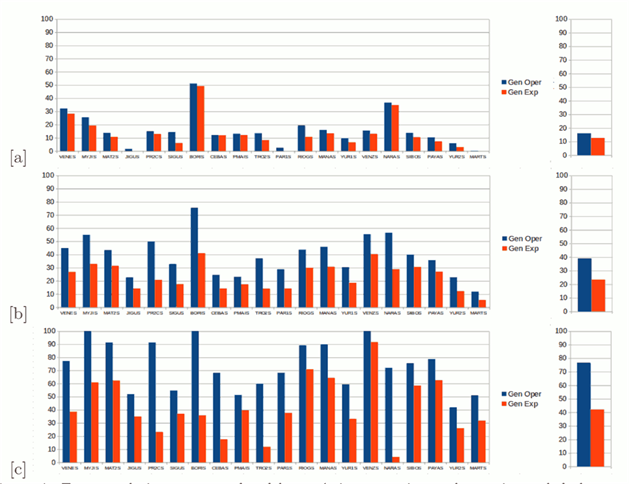 The most important feature revealed by the evaluation of photovoltaic generation forecasts is the overestimation of values with respect to the reported data, this situation occurs more intensely on cloudy days, but it is also noticeable even on clearer days, although to a lesser extent. The value of generation in each park is calculated from the forecast of solar radiation provided by the WRF model. A simultaneous analysis of the outputs of radiation and generation by parks, shown in figure 3, reveals that the overestimation in percent of generation is almost identical to that of radiation, that is, the error in photovoltaic generation is fundamentally caused by the error in the forecast of solar radiation. The average relative errors of the daily sums of radiation and generation among the selected parks were 40 % for the complete sample, in the subset of mostly clear days they were 15 % and for the cloudiest days the errors reached 84% in radiation and 78 % in generation.