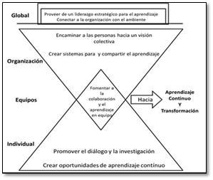 Sin embargo, en las tres últimas décadas, tanto el AO como la organización que aprende han cobrado especial importancia, a partir de los trabajos de Garvin (1993) en que define la organización que aprende como aquella “organización que es competente en la creación, adquisición y transferencia de conocimiento y en la modificación de su comportamiento para reflejar el nuevo conocimiento” [6]. No obstante, a finales de los años 90 existían pocas investigaciones empíricas que dieran sustento a la aplicación de estas teorías y la mayoría de los investigadores argumentaban que existía una considerable confusión sobre estos temas. Un estudio sobre la dimensionalidad del constructo y su interrelación con otras dimensiones organizacionales, permitiría comprender mejor el AO y la organización que aprende [8]. Watkins y Marsick (1993, 1996) proporcionaron un modelo integrador de una organización de aprendizaje, en la figura 1.