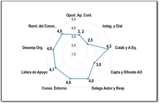 Otra dimensión que resultó crítica en esta organización según la percepción de este grupo; también con una mediana de 2.5, fue: los sistemas para captar y difundir el aprendizaje, dimensión referida al esfuerzo de la organización por desarrollar y mantener sistemas de procesamiento de datos de manera eficiente y efectiva, además de compartir el aprendizaje entre los miembros de la organización y el desarrollo de procesos para crear y compartir una visión colectiva y obtener retroalimentación de sus miembros acerca de la brecha entre la situación actual y la nueva visión, con una mediana de 3. Con los resultados del diagnóstico y la sistematización de los enfoques y teorías sobre el aprendizaje organizacional y sobre cómo construir organizaciones que aprenden, las autoras aplicaron la técnica de la Evaluación 3600 al Consejo de Dirección de la organización; además propusieron un sistema de sugerencias, y se les pidió colaboración para establecer un plan de mejoras para fomentar las transformaciones necesarias en la UNE hacia una Organización que aprende.