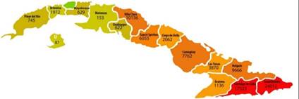 El 17% de la superficie cubana es montañosa, y se estima que viven en ella más de 720 000 personas [22], así mismo existen unas 66 420 viviendas aisladas del SEN, como se muestra en la figura 1 y recibiendo un pobre servicio eléctrico que no cubre más que 4-6 horas al día o cuenta con poca calidad. La población de estas zonas rurales se distribuye en asentamientos dispersos y de difícil acceso. Estas comunidades cuentan con servicios para los cuales el suministro energético resulta complejo desde el punto de vista técnico y mediante Grupos Electrógenos (GE), que utilizan Diésel que es sumamente costoso e insostenible. Existen actualmente 466 Grupos electrógenos, instalado en comunidades rurales cubanas, con potencias entre 6 y 455 kVA, los cuales consumen anualmente unos 10410800 litros de diésel. Estos Grupos Electrógenos pueden ser utilizados como respaldo en las micro redes eléctricas, dotando a estos sistemas de robustez y fiabilidad [23]. Para dotar a estas poblaciones de electricidad mediante fuentes más eficientes, y evitar la migración forzada a las ciudades, se inició el programa nacional de electrificación rural, en el marco de la política energética cubana.
