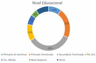 Usualmente en estos contextos rurales, los pobladores se encuentran asociados a actividades productivas desde tempranas edades, mayormente agrícolas, ganaderas y mineras, provocando que la formación educacional no siempre sea una de las prioridades. En la figura 2, se muestra la distribución del nivel de escolaridad predominante en estos entornos; demostrando que el nivel educacional predominante son los estudios secundarios finalizados con un 34 % mientras que los estudios superiores ocupan solo un 5%. Este nivel educacional predominantemente bajo, resulta un desafío a sortear en el proceso de lograr la aceptación tecnológica por parte de los pobladores. Así mismo, dadas las difíciles condiciones de accesibilidad a muchas de estas zonas, resulta una práctica beneficiosa lograr formar capacidades locales que permitan crear brigadas de operación y mantenimiento para atender los sistemas tecnológicos que compongan la micro red eléctrica. Por lo que, muchas veces el nivel educacional pudiera complejizar bastante esta labor y limitar de cierta forma la independencia energética y auto gestión local de las micro redes.